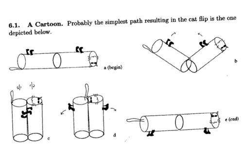 SJLとMPのお別れパーティーで話題になった、猫がどうやって落ちるときに下向きになれるのか、という話題。物理的に不可能?ぐーぐるさんに聞いたところ、猫の回転のゲージ理論という論文があることをW発見。論文中のこの漫画に大笑い。。。いや、ちょっと無…